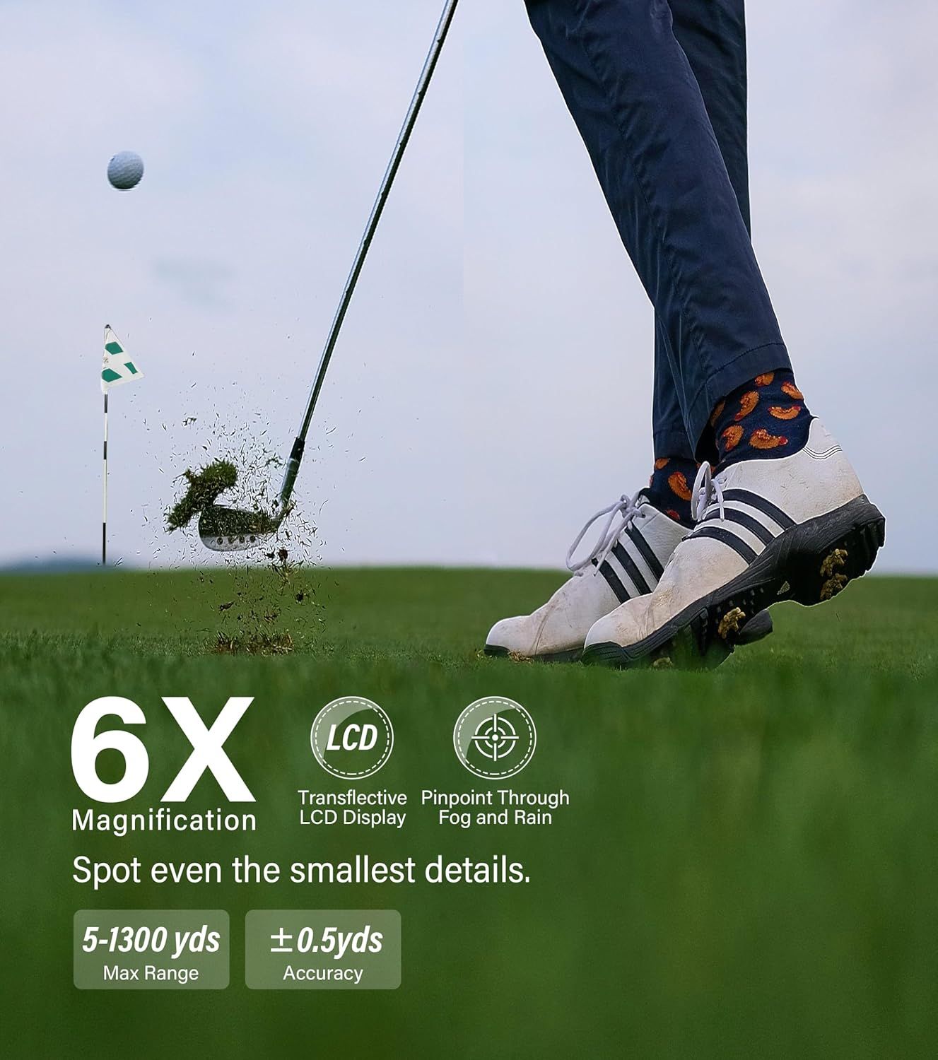 - Capture Details in the Distance: Discover a new level of clarity with 6x magnification which allows you to experience unparalleled visibility that reveals every object in stunning detail. and When you lock onto the pin, the rangefinder provides vibrating feedback to ensure accuracy. Plus, this rangefinder maintains its precision even in fog and rain.